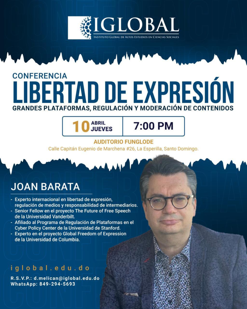 Santo Domingo, 1 de abril del 2025) – El Instituto Global de Altos Estudios en Ciencias Sociales (IGLOBAL) y la Fundación Global Democracia y Desarrollo (FUNGLODE) se complacen en anunciar la agenda de actividades del reconocido experto internacional Joan Barata, quien visitará la República Dominicana del 7 al 10 de abril del 2025.