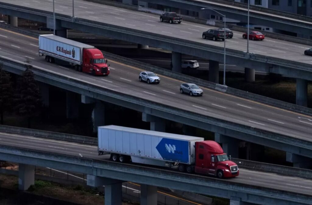 Camiones circulan por la Interestatal 80 en Albany, California. California se prepara para revocar 17,000 permisos de conducir comerciales que se expidieron a inmigrantes cuya fecha de caducidad superaba la duración de su estancia legal en Estados Unidos. (Justin Sullivan / Getty Images)