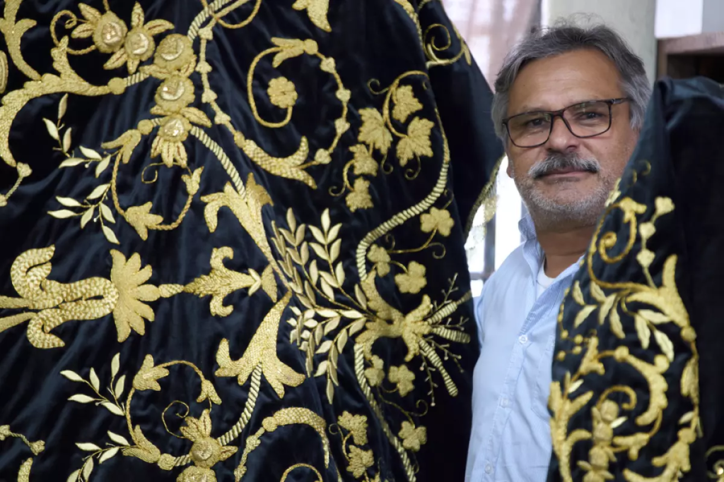 Para el ajuar de luto de la madre María ha confeccionado este año, durante meses de trabajo, una túnica en terciopelo negro con rosas y floreros bordados en hilo dorado. Es tradición, según cuenta, no contarle a la iglesia de la que saldrá la imagen cómo estará vestida: para sorprender al público.