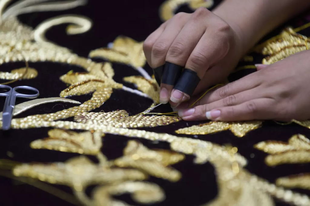 Después, viene el trabajo en finas telas, como el terciopelo, para luego crear bordados en hilos dorados o plateados, generalmente en forma de flores, que serán cosidos al manto.